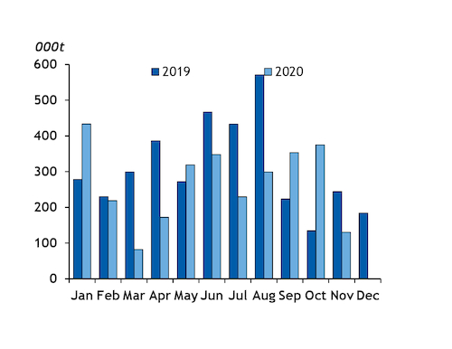 A total of 130,000t of Eurobob oxy barges changed hands in November, from 375,000t in October and 244,000t a year earlier. The monthly total was the lowest since March, with total 2020 oxy volumes down by 16pc for the year to date at 2.96mn t.