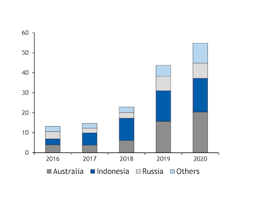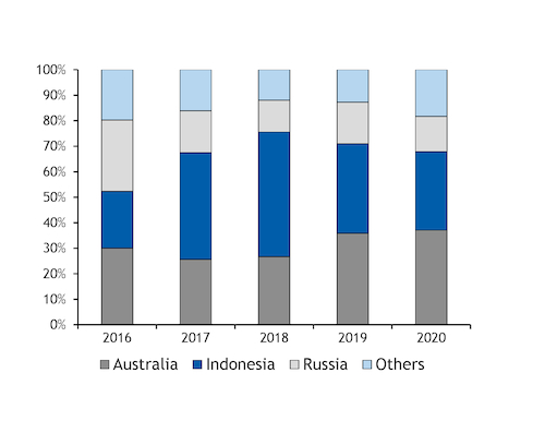 Vietnam absorbed some of the surplus arising from Beijing's informal ban on Australian coal, with imports from Australia reaching a record 20.34mn t in 2020, up from 15.7mn t a year earlier, customs data show. In contrast, Vietnam imported 16.85mn t from Indonesia last year, which was up from 15.3mn t in 2019. Imports from both countries totalled 37.19mn t last year, accounting for more than two-thirds of Vietnam's total imports of 54.81mn t. Vietnamese customs data do not differentiate between coking and thermal coal.