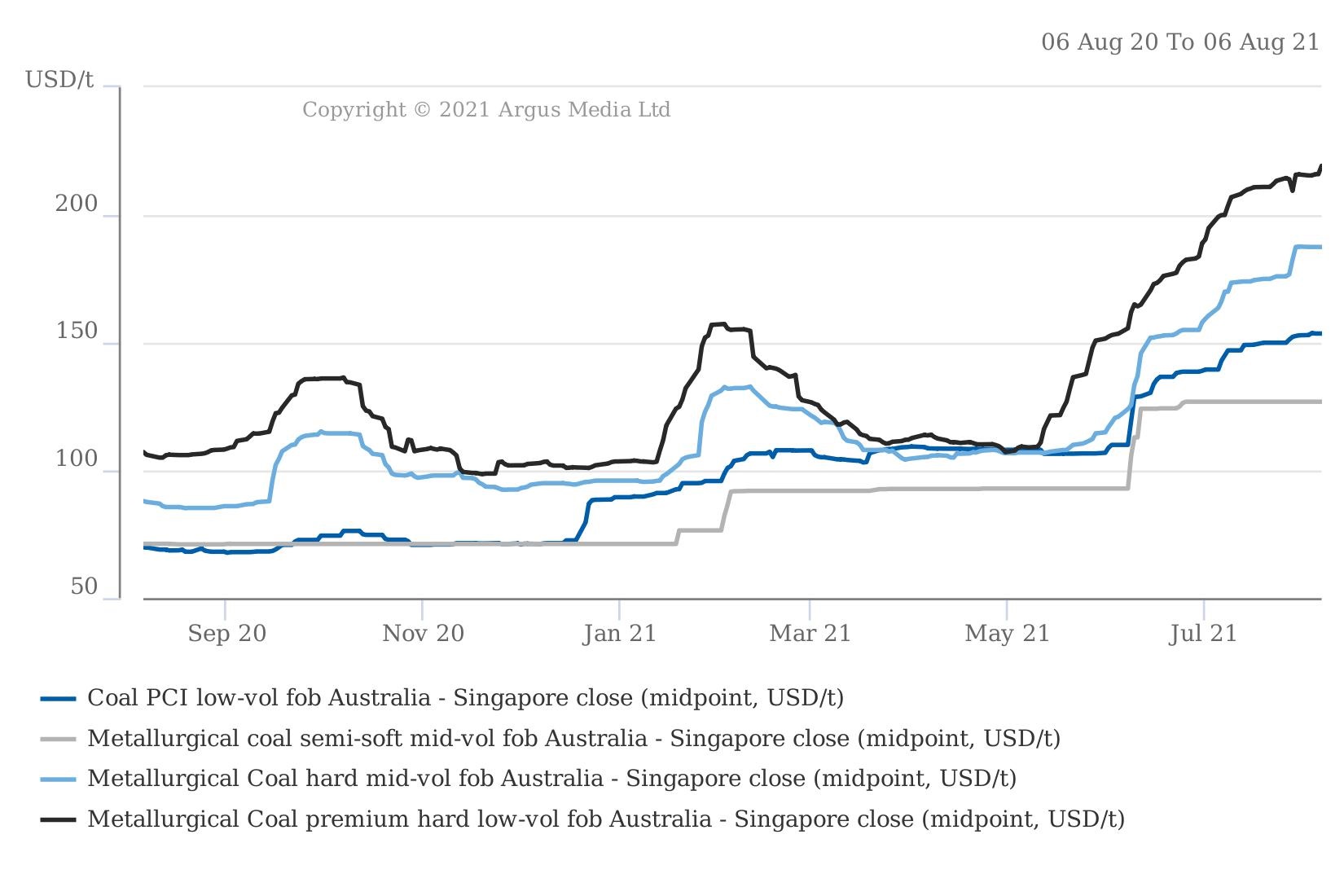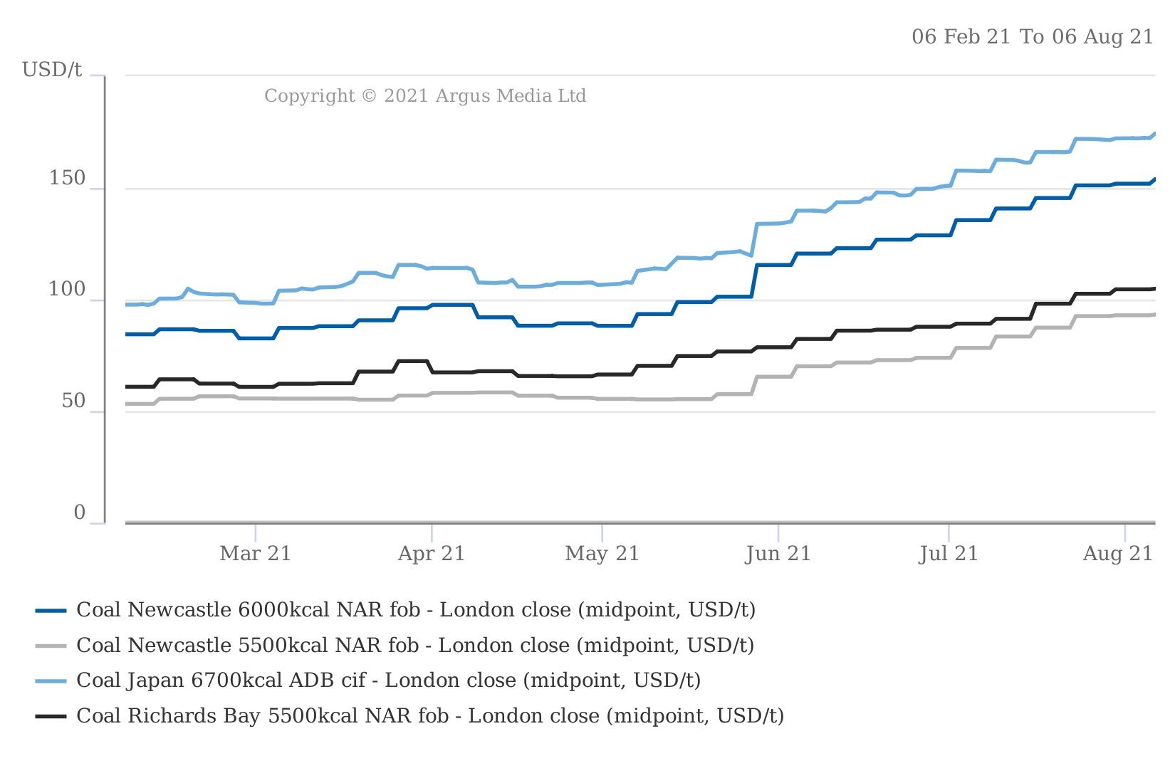 Argus last assessed the premium hard low-volatile coking coal price at $219.25/t fob Australia on 6 August, up from $155.25/t on 8 February and from $103.50/t at the start of January. It assessed the high-grade thermal coal price at $153.99/t for 6,000 kcal/kg NAR on 6 August, up from $84.41/t six months earlier.