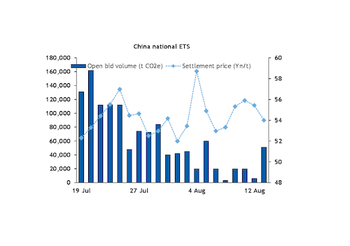 The bulk agreement was done on 9 August at an average price of Yn50.39/t, 5.5pc lower than the open bid price on the same day. Open bid trading volume was just 3,010t of CO2e on 9 August, the lowest since the ETS launched in July.