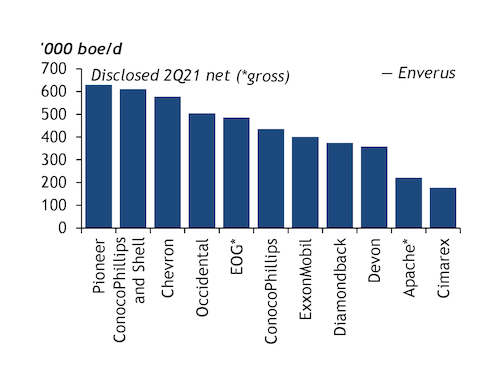 Pioneer chief executive Scott Sheffield, who has built his firm into the Permian's biggest producer through a recent series of acquisitions, agrees that size and scale are key for this new investor model (see chart). He also cites low breakeven prices and operating costs, as well as a strong balance sheet. "The Permian is going to be the place to be, it always has been — it's over 50pc of the US rig count — and it will continue to be," Sheffield told the Rystad Energy Week 2021 conference. The Permian will continue to see modest growth while other shale basins enter decline, he predicts.