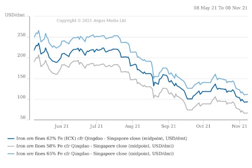 The Argus ICX iron ore was last assessed at $91.85/dmt cfr Qingdao on a 62pc Fe basis on 9 November, down from $118.80/dmt on 25 October and a high of $235.55/dmt on 12 May. Argus assessed 58pc Fe at $65.10/dmt cfr Qingdao on 9 November, down from $89.85/dmt on 25 October and a high of $207.10/dmt on 12 May.