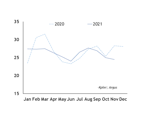 But crude stocks in China are still falling, rather than rising. The country's independent refiners have, so far, bought far fewer January-arriving cargoes than is usual for the time of year — just a third of the amount traded on the delivered ex-ship (des) market by this point in 2019 and two thirds of what they had purchased by mid-November 2019. This suggests that refiners may be running out of time to secure sufficient feedstock to meet January requirements from the long-haul crude markets, as their own operating inventories already appear low (see graph: Independent refiner crude stocks).