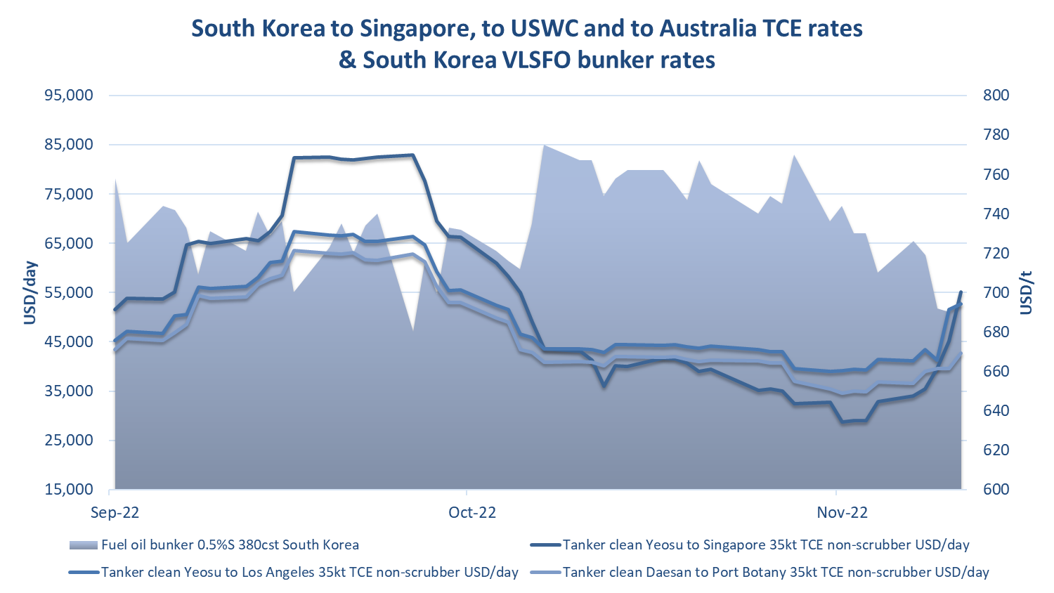 Argus assessed time charter equivalent (TCE) rates from South Korea to Singapore, to the USWC and to Australia up by about 90pc, 33.3pc and 21.8pc to $55,214/d, $52,379/d and $42,533/d respectively on 14 November, from $29,071/d, $39,300/d and $34,910/d on 3 November.