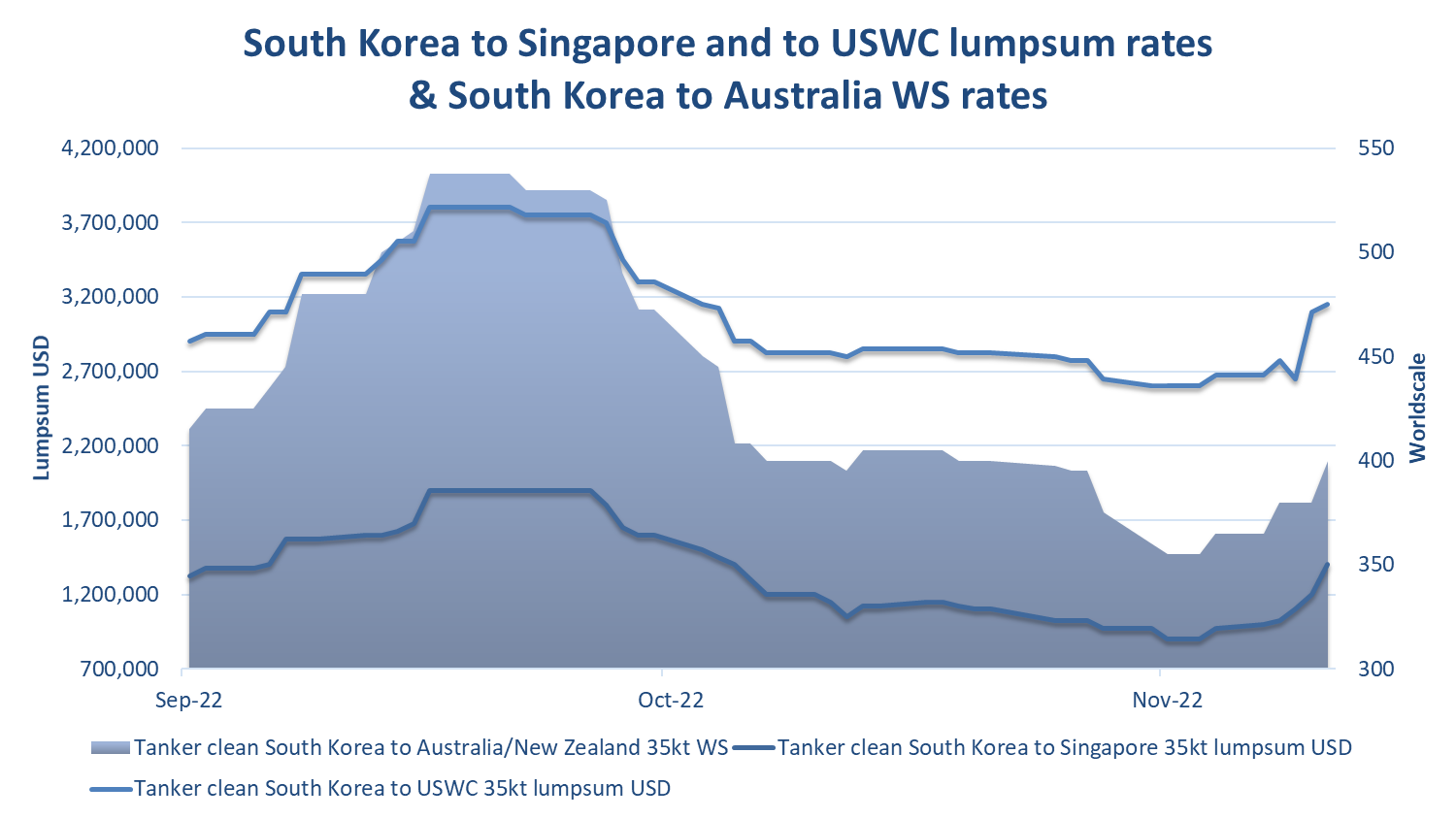 Lumpsum freight rates for 35,000t shipments from South Korea to Singapore and to the US west coast (USWC) rose by about 56pc and 21pc to $1.4mn and $3.15mn respectively on 14 November, from $900,000 and $2.6mn on 3 November. Worldscale (WS) rates for the South Korea-Australia route rose by about 13pc to WS400 on 14 November from WS355 on 3 November.
