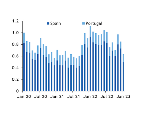Spanish LNG receipts are on track to fall to their lowest for any month since September 2021, while Portuguese receipts could slip to their lowest since July 2021, as weak consumption and lower prices limit the incentive for firms to utilise Iberian import terminals.