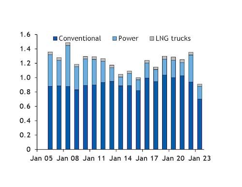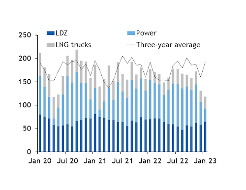 Spanish LNG deliveries of 2.6mn m³ on 1-24 January average out at 108,000 m³/d, which is lower than any full-month pace since September 2021. This left the country's LNG stocks at 2.3mn m³ this morning, the lowest for any date since 22 December. And four more vessels carrying as much as 670,300m³ — judging by vessel size — have declared for Spanish terminals on 25-31 January. Assuming the vessels deliver full cargoes, this could take January deliveries to 3.3mn m³ — still the lowest since September 2021. Sendout has also fallen sharply, at just 500 GWh/d on 1-24 January — also on track to be the lowest since September 2021 (see sendout graph).