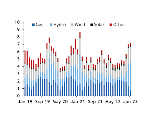 Gas consumption in Spain averaged 909 GWh/d on 1-24 January, putting demand this month on track to be the weakest for the month since at least 2006, driven by exceptionally low demand from industry, households and small businesses, and the power sector (see Spanish graph). Portuguese consumption of 119 GWh/d is on track to be the lowest for any month since April 2020 (see Portuguese graph). Power sector demand of just 28 GWh/d in Portugal would be the lowest for any full month since February 2021. Gas-fired generation has collapsed as Portuguese wind and hydro generation have soared since December, prompting net power exports towards Spain — Portugal had been a net importer from its neighbour every month since March 2021 (see generation graph).