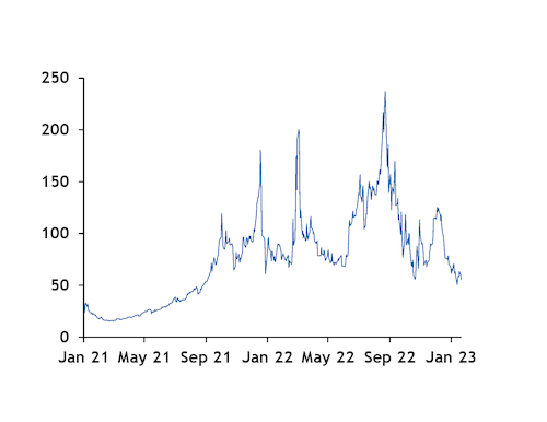 The fall in consumption has also weighed heavily on PVB prompt prices. The PVB front-month price fell to €50.75/MWh on 16 January, the lowest for any date since 27 August 2021 (see price graph).