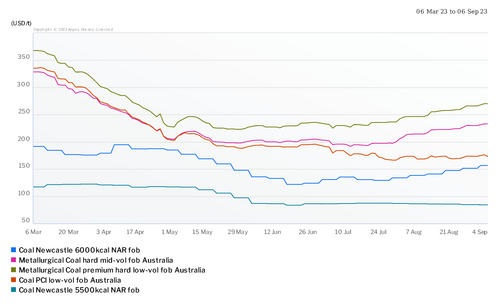 Argus last assessed high-grade 6,000 kcal/kg NAR thermal coal at $156.51/t fob Newcastle 1 September, up from $133.87/t on 28 July but down from a peak of $444.59/t fob on 9 September 2022. It assessed low-grade 5,500 kcal/kg NAR thermal coal at $84.24/t fob Newcastle on 1 September, down from $86.18/t on 28 June and from $199.12/t fob on 9 September 2022.