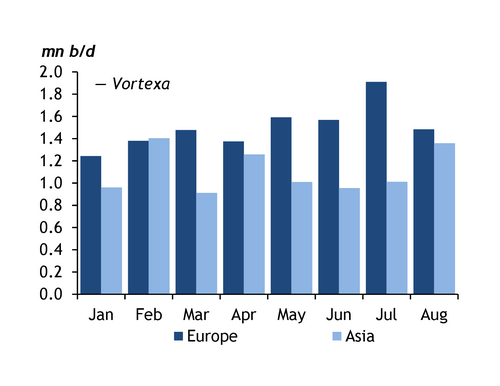 And while Asian demand has affected WTI prices, it has not significantly affected the amount of crude going transatlantic. A record of almost 2mn b/d arrived in Europe in August, up from 1.8mn b/d in July. Most of this would have traded in July, when the price of WTI was relatively low in Rotterdam. Even so, exports to Europe in the second half of August — when WTI was priced above Brent and Forties — were still 1.7mn b/d. Combined loadings of the benchmark's five North Sea grades, by contrast, will be just 513,000 b/d this month.