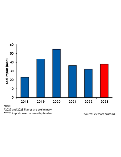 But demand from utilities has continued to increase with the rise in power demand as well as growth in economic activity. Total power supply in the system, including generation from all sources of energy and imports, reached 209.9TWh in January-September, up by 3.1pc from the same period in 2022, according to state-owned utility EVN. Industrial coal demand likely edged higher with Vietnamese industrial production rising by 5.1pc in September from a year earlier, according to the GSO data.