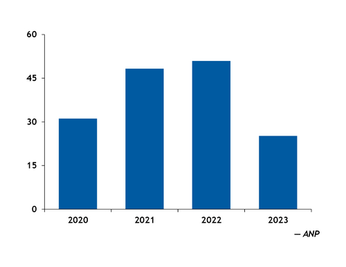 The country produced 22,515m³ (20,265 metric tonnes) in October, down from 52,370m³ a year earlier, according to oil and gas regulator ANP. Compared with September, output in October was down by 55pc.