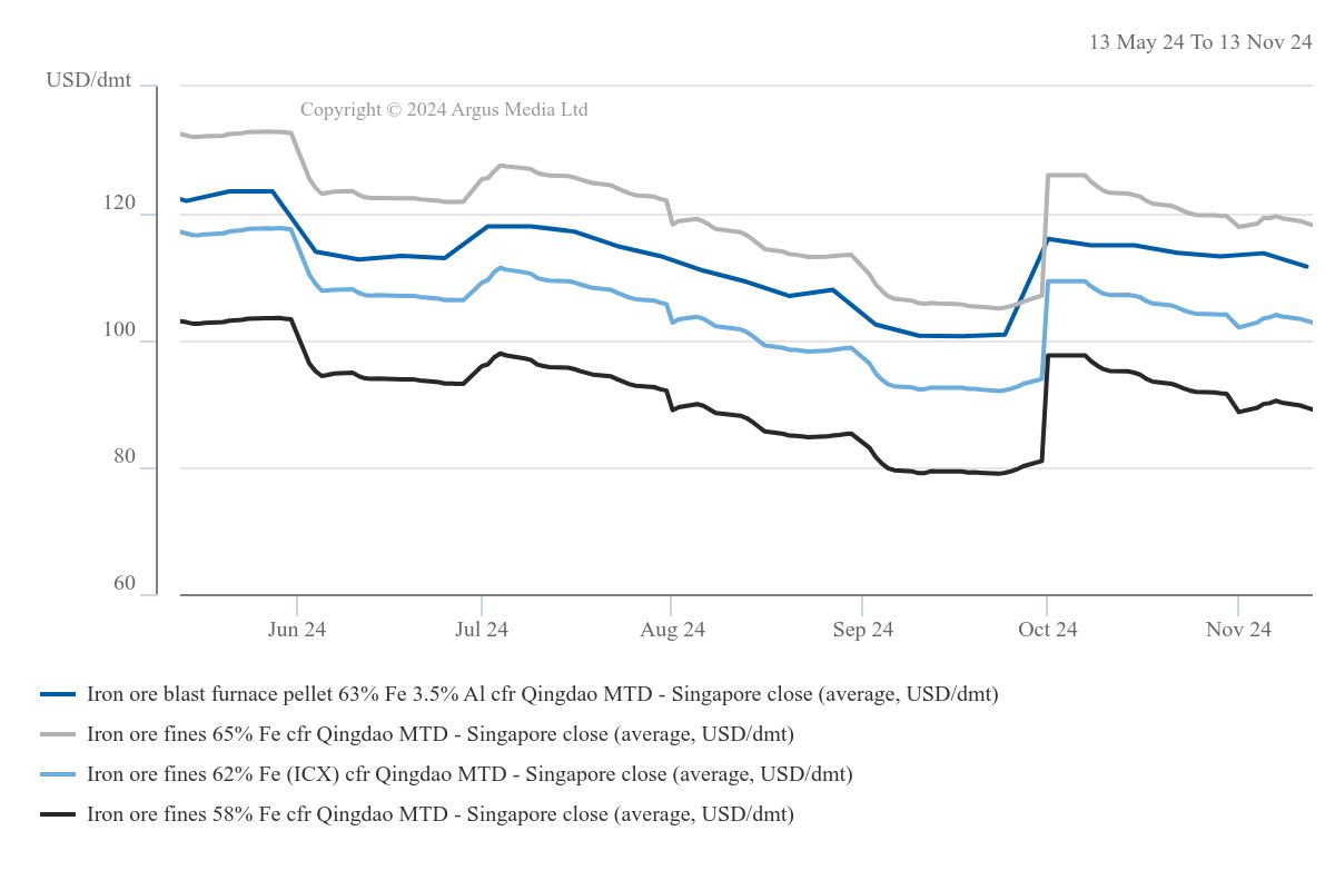 The Argus ICX 62pc iron ore index was at $100.70/dry metric tonne (dmt) cfr Qingdao on 13 November compared with $107.25/dmt on 14 October.