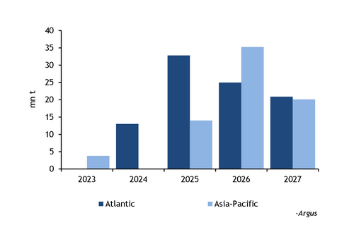 Nearly all projects with 2024-25 operational dates are based in the Atlantic basin, with the exception of Canada's 14mn t/yr LNG Canada export terminal, located off the coast of northern British Columbia. Operator Shell plans to start loadings in mid-2025.