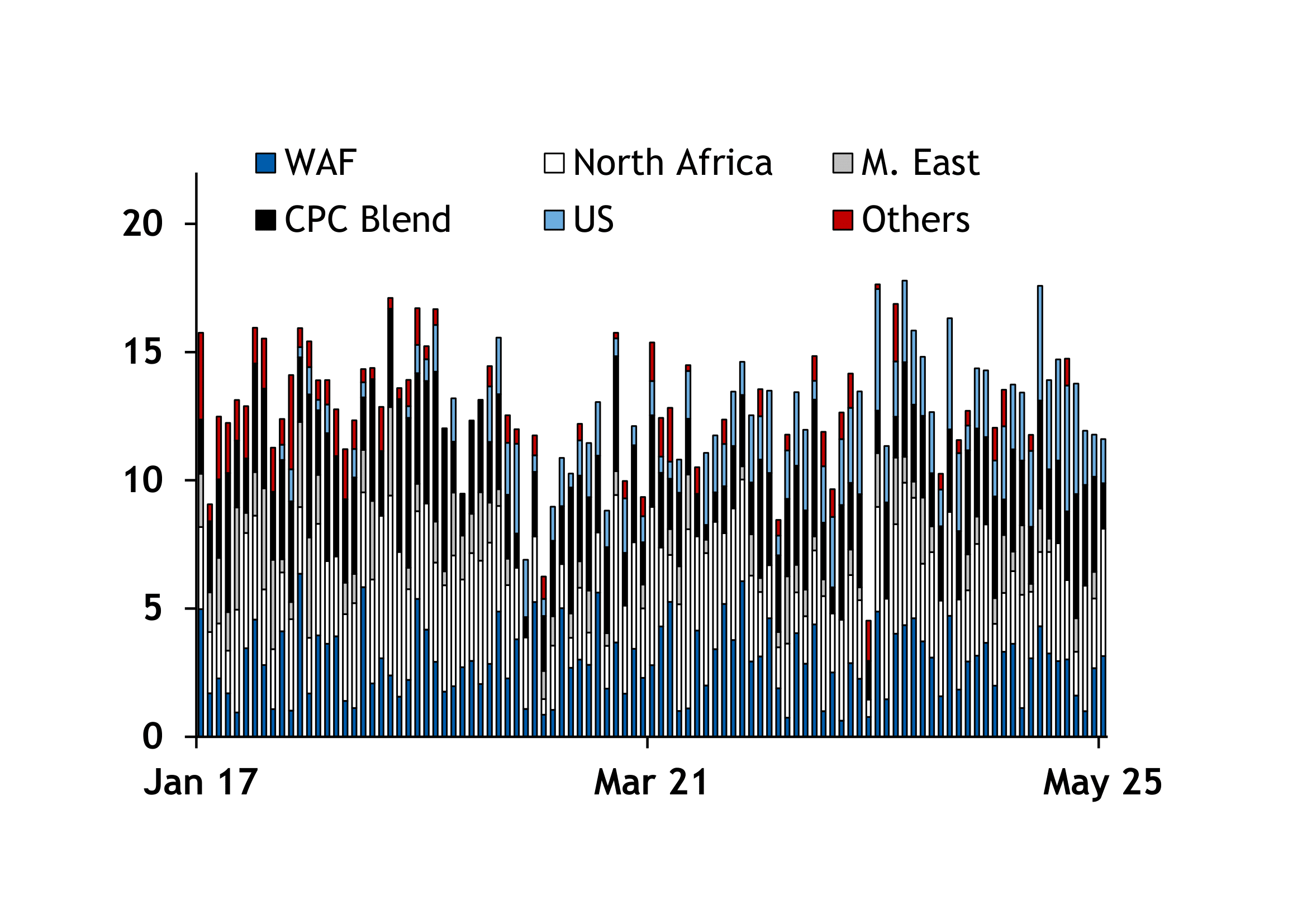 In May, supplies comprised 110,000 b/d of Libyan crude split between Esharara, Sarir and Mellitah, 60,000 b/d of Caspian CPC Blend, 55,000 b/d of US WTI, 50,000 b/d of Nigerian crude split between Qua Iboe and Abo, 50,000 b/d of Algerian Saharan Blend, 30,000 b/d of 20°API Lokele from Equatorial Guinea and 20,000 b/d of 28°API Doba from Chad.