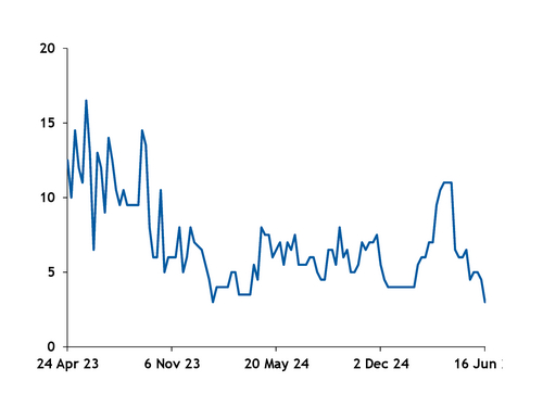Fob US Gulf coast mid-sulphur coke's premium to the high-sulphur product dropped to $3/t on 18 June, down by $2/t on the week, after 4.5pc sulphur coke prices fell by $2.50/t to $70/t while the 6.5pc sulphur specification edged down by $1/t to $67/t fob. This was the lowest premium since late January 2024. It was also down from $6.50/t the week of 14 May and $11/t on 16 April.