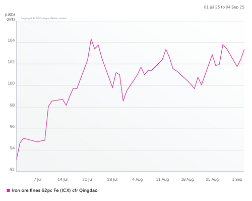 • Argus' iron ore fines 62pc Fe (ICX) cfr Qingdao price has been rising since the start of July. It was last assessed at $103.35/t on 3 September, up from $93.05/t on 1 July.