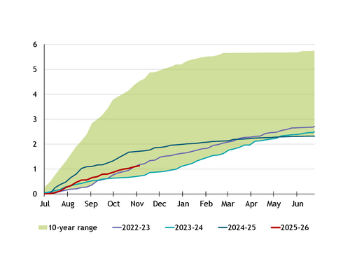 Similarly, barley and corn exports have also slowed on the week. Ukraine exported 42,000t of barley on 3-9 November, down from 63,000t a week earlier. Its cumulative exports since the beginning of July have been behind 2023-24 levels, and now have fallen slightly below the level in marketing year 2022-23, despite having shipped more in the first four months of the season (see graph).