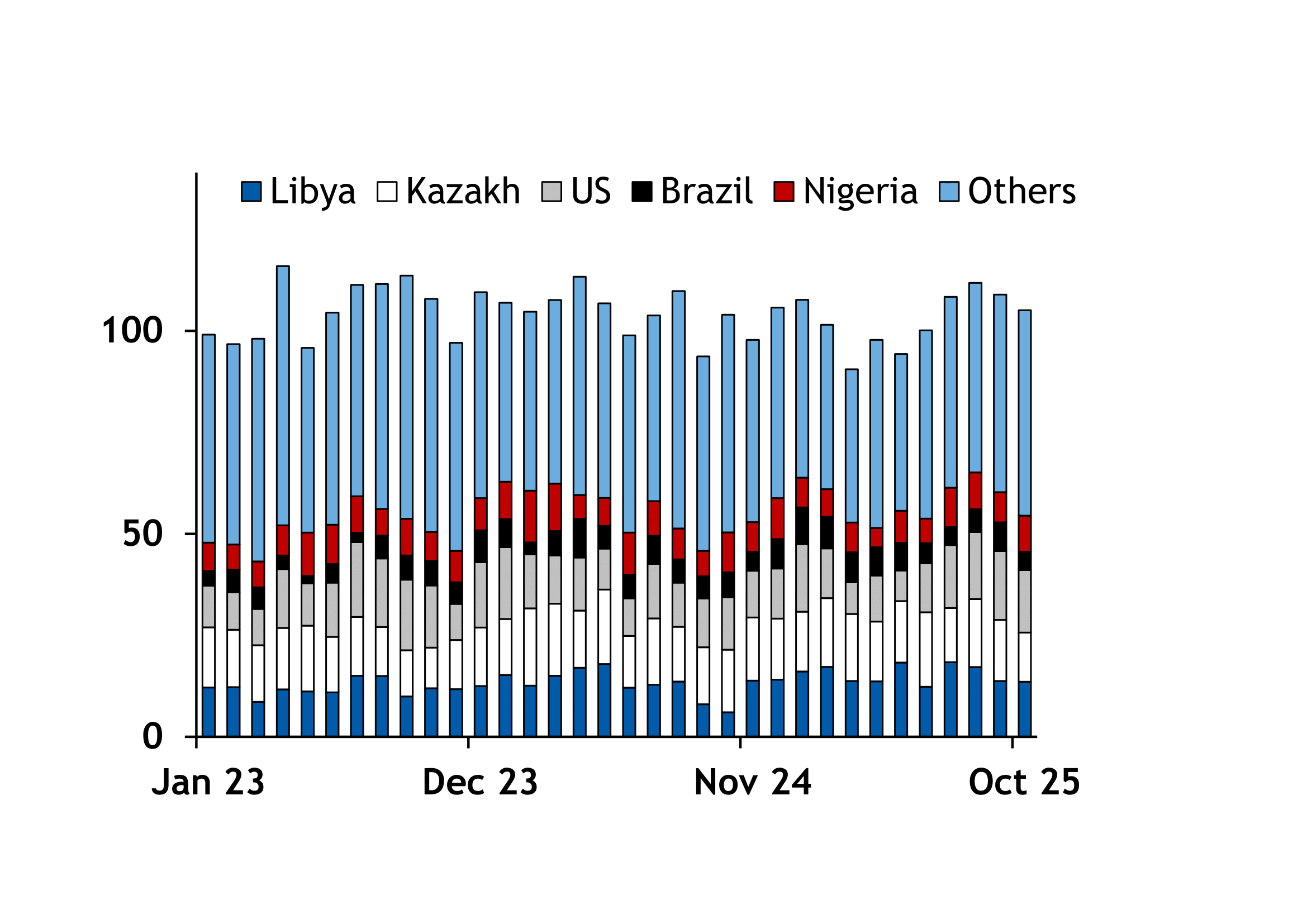 For the second month in a row the biggest crude supplier to the Mediterranean region was the US, with 495,000 b/d down from 565,000 b/d in September. Libya supplied 440,000 b/d and Iraq 445,000 b/d. This was the most Iraqi crude in the Mediterranean since November 2023, supported by strong Greek demand for Basrah Medium, plus returning Kirkuk supply.