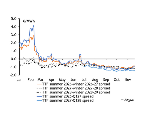TTF summer-winter spreads for gas year 2026-27 and 2027-28 have improved in recent months but remained narrow at -€0.97/MWh and at -€1.25/MWh, respectively, at the last close (see summer-winter spread graph). And the 2028-29 summer-winter spread closed at -€1.185/MWh. Narrower and even inverted summer-winters spreads limited storage capacity bookings in Europe last year.