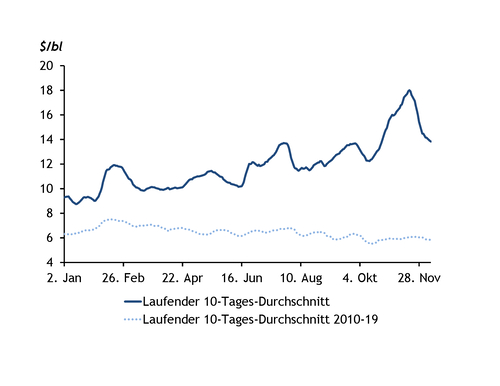Einige Händler sind der Ansicht, dass die jetzt gesunkenen ICE Gasoil Futures besser die reale physische Angebots- und Nachfragesituation in Europa widerspiegeln. Die Wartungssaison in europäischen Raffinerien ist größtenteils beendet, und auch die befürchtete Verknappung des Import-Angebots aufgrund von Sanktionen wird voraussichtlich nicht eintreten. Entsprechend sei die Preis-Rallye zwischen Ende Oktober und Mitte November, sowie die stark gestiegene Backwardation, demnach vor allem durch Panik im Markt und Spekulationen getrieben worden. Die Backwardation, also die Prämie für promptes Laden gegenüber einem späteren Ladefenster, stieg Anfang November stark an und erreichte am 6. November über 50 $/t. Am 10. Dezember lag die Prämie vom Frontmonat Dezember der ICE Gasoil Futures gegenüber dem Januar-Kontrakt lediglich bei knapp 4 $/t.