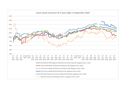 Indonesia's implementation of a 50pc biodiesel (B50) blend mandate and ongoing palm plantation seizures may raise palm oil prices and reduce global waste oil supply, likely keeping palm oil mill effluent (Pome) oil prices supported in 2026.