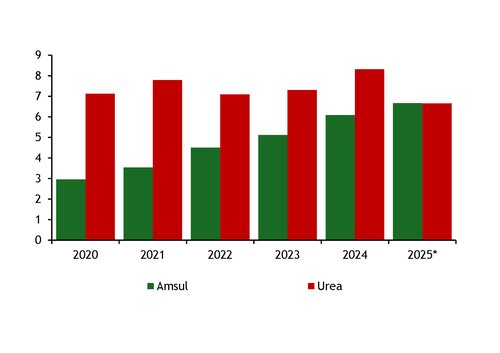 Brazil's urea imports have historically been 2mn-3mn t/yr higher than its amsul imports, but urea's lead has eroded as amsul has become more affordable for farmers. Amsul is also more easily available and has less volatile pricing. Brazil's amsul imports almost tripled over 2018-24, rising to more than 6mn t/yr, while urea imports increased by almost 2mn t/yr to around 8mn t/yr over the same period.