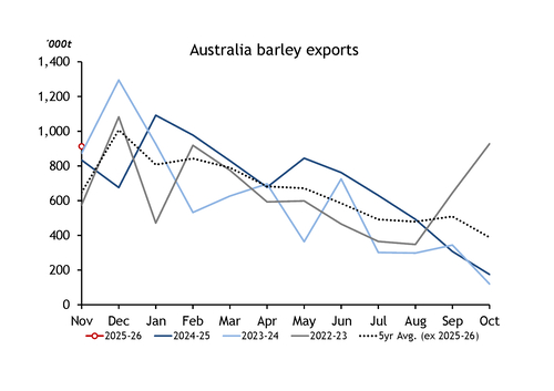 Barley exports reached 913,000t in November 2025 — the largest volume for the month of November, according to ABS records dating back two decades.