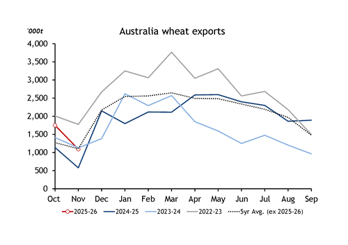 Wheat exports approached 1.1mn t in November, around the average for the previous five years. But unseasonably strong exports in October pushed up total exports for the 2025-26 (October-September) marketing year so far by 66pc from the same point last year. But it is still early in the export campaign.