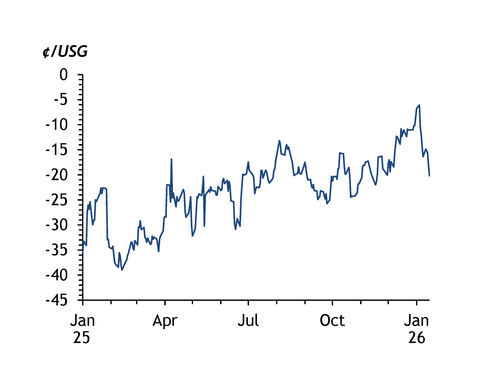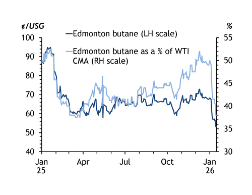The usual seasonal winter increase in butane prices has also not materialised, with the Edmonton value averaging 66.53¢/USG, or 46.8pc of CMA WTI, in the fourth quarter, down from 91.75¢/USG, or 54.5pc, a year earlier. And as the market enters 2026, it is being confronted by geopolitical volatility that is having complex effects on prices. This especially applies to one type of butane consumption in western Canada — as a diluent for heavy crude produced from the country's oil sands.