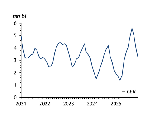 Butane exports are likely to have increased in 2025. Canada shipped an average 59,400 b/d by pipeline, rail and truck to the US over January-October, up from 56,100 b/d for the whole of 2024 and also higher than the five-year average of 52,300 b/d, the latest CER data show — the country currently exports predominantly propane from its seaborne terminals on the Pacific coast. But rising butane exports could not provide enough of a relief valve to offset climbing stocks.
