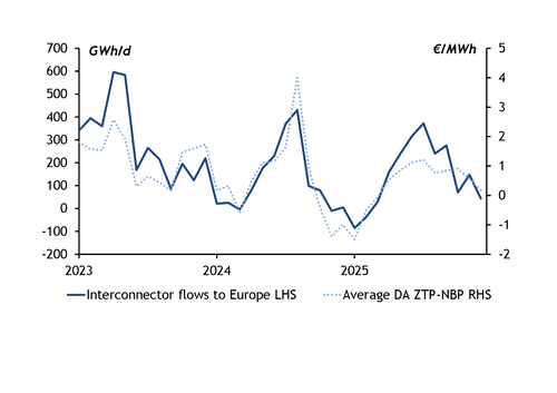 This scenario assumes UK March gas demand will hold in line with the four-year average of 201mn m³/d. UK pipeline exports to Belgium could average 21mn m³/d, with ZTP premiums to the NBP for March at 82¢/MWh — more than the variable costs to flow on the Interconnector for firms that have booked transmission capacity between the two countries. In May, August and September last year, ZTP day-ahead premiums to the NBP averaged the same as the forward March 2026 spread at 82¢/MWh, and flows to Belgium averaged 21mn m³/d in those months. There has been a 0.82 positive correlation over the last three years with day-ahead price spreads and flows to Belgium.