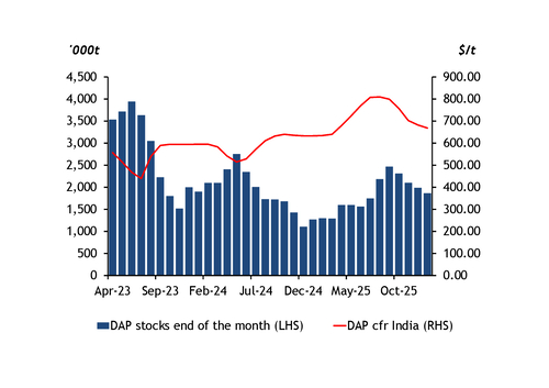 But firm imports earlier in the fertilizer year — starting in April 2025 — and a slip in total offtake so far have allowed India's DAP stocks to build by almost 600,000t year on year, according to Argus data.