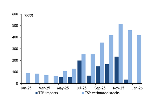 Even though domestic TSP offtake has almost doubled on the year, and India has no domestic TSP production, the country has already imported around 145pc more TSP than it did over the 2024-25 fertilizer year — all from Morocco. This has allowed India's TSP stocks to swell by 563pc since April 2024, according to Argus estimates.