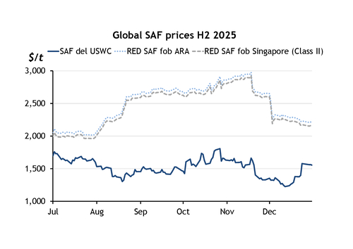 Global SAF prices H2 2025 $/t