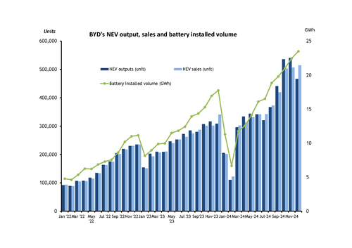 New energy vehicle (NEV) output and sales from China's largest NEV manufacturer BYD hit record highs in 2024, exceeding 4mn units for the year.