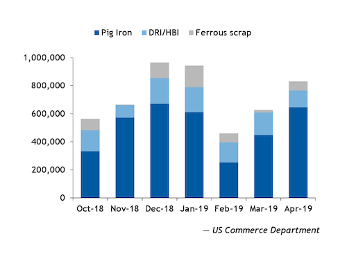US southeast imports of ferrous scrap doubled year over year in April 2019, while pig iron imports rose against fewer HBI/DRI shipments.