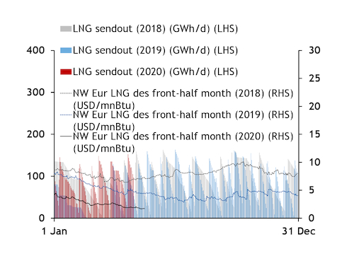 Klaipeda sendout has been quick so far this year (see graph). The terminal is currently used by five companies and terminal operator Klaipedos Nafta is offering slots equivalent to 44.4 TWh/yr for October 2020-September 2021 until 25 May, it said last month. Most cargoes delivered to the terminal are from Norway, although the facility received its first US LNG cargo of the year yesterday. The tanker was diverted towards Lithuania after it had initially been expected to deliver to the UK last month.