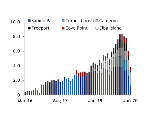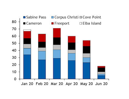 Aggregate feedgas flows to the six liquefaction facilities in the US fell to 3.8bn ft³/d (107mn m³/d) on 1-15 June from 5.35bn ft³/d a year earlier, despite additional export capacity of 29mn t/yr coming on stream over the past 12 months. Feedgas flows peaked at 8.38bn ft³/d in February, before additional capacity of about 12mn t/yr came on line. The third 5mn t/yr train at the Cameron LNG facility in Louisiana began production in May, shortly after the third 5.31mn t/yr liquefaction train at the Freeport terminal in Texas started. Four smaller liquefaction trains at the Elba Island facilities, each with a capacity of 400,000 t/yr, have also started production since February.