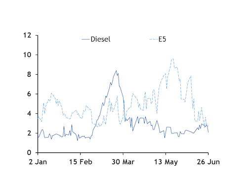 German E5 prices have recovered to a premium of above €6/100l to Eurobob barges on average since mid-June, indicating that demand has caught up with an early rise in production. The premium covers the GHG quota costs and can give a profit margin to suppliers with access to cheap biofuels. The premium to ARA was below €3/100l at times in late May, when refineries started increasing runs. As this did not cover the cost of blending ethanol, it effectively priced the non-blended product below Eurobob for export, pointing to an overhang and a lack of storage capacity. Official data released yesterday for April put the year-on-year fall in inland deliveries of gasoline at just 34.5pc. The drop is far smaller than reported at many retail stations and is likely to include product still in storage.