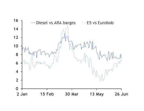 Refiners started ramping up runs from around 70pc in April at the first sign of stronger demand, which pushed stocks to their limit and compressed premiums to prices in the Amsterdam-Rotterdam-Antwerp (ARA) hub. Diesel fell to just €7.75/100l ($102.32/t) above ARA barge prices on average from mid-May to mid-June, from €10.50/100l in March and April. Most of the current premium covers the costs of the greenhouse gas (GHG) reduction quota and is even lower than the €8.50/100l seen in January-February before any lockdown measures.