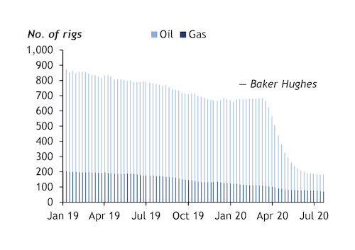 Oil and gas employment was already falling from its December 2018 high throughout 2019, as crude prices refused to stay above $65/bl. Production costs were also falling, as shown by record output with a declining rig count (see chart). But the Opec+ price war and the Covid-19 demand shock turned those declines into a stampede.
