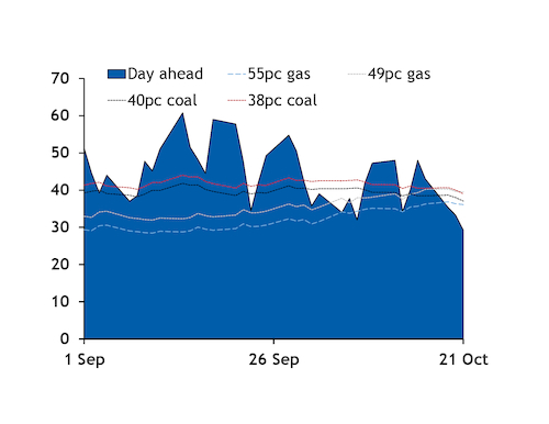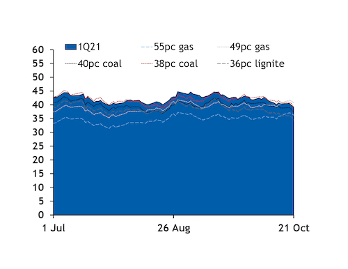 Break-even costs suggest a 43pc efficiency lignite-fired unit has entered the base load market this month, followed by 61pc and 59pc units. But a 55pc unit remains ahead of all coal-fired stack in the merit order.