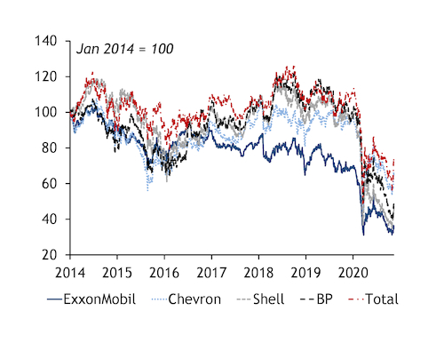 While its peers have all constrained their capex since 2016, ExxonMobil was set to increase capex to as much as $35bn next year until this year's price crash. Its outlook now is for $16bn-19bn in 2021. But the aggressive dividend growth that started in 2012 has now reached $3.7bn per quarter. ExxonMobil generated $4.4bn in cash from operations in the third quarter, resulting in a net debt increase of $3bn — a pace that in theory could make it unable to pay the dividend by late next year.