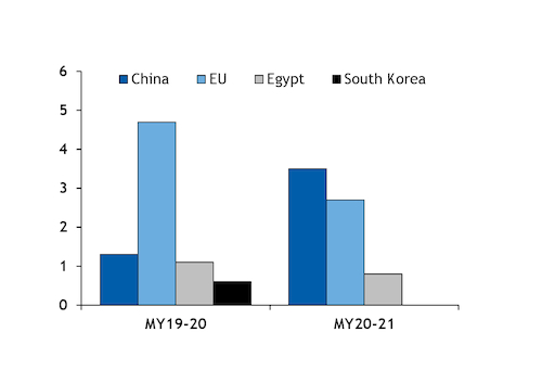 Ukrainian corn exports to China have nearly tripled, with more than 3.5mn t of the grain having shipped since 1 September, compared with just 1.3mn t over the same period of last year. And total exports to China are expected to reach about 7mn t by the end of the 2020-21 marketing year, up by 1.5mn t from the record 5.5mn t exported in 2019-20.