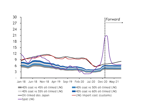 Coal's share of the thermal generation mix shrunk in favour of LNG to 42pc in September from 48pc in April as Japanese gas prices were pushed lower by weak oil markets during the initial outbreak of Covid-19. But LNG prices have since been supported by recovering oil markets, which have been boosted by the rollout of vaccines across the world.