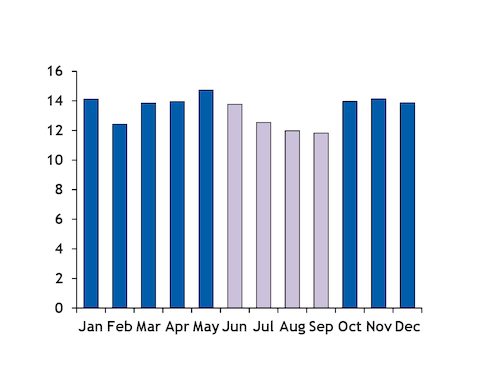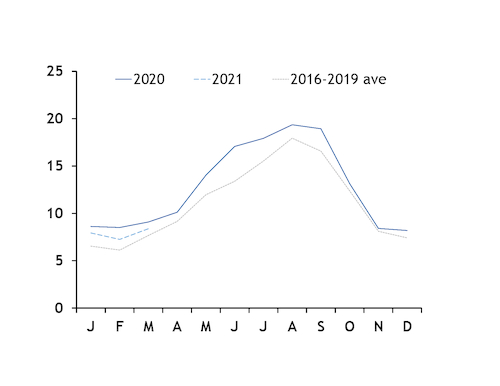 India's coal imports in June-September are usually lower than at other times of the year (see chart). This is partly because buyers look to avoid the monsoon deluge, but also as this is when hydropower generation peaks, which can trim fossil fuel demand.