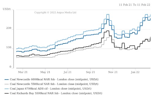 Argus assessed the high-grade thermal coal price at $257.17/t for 6,000 kcal/kg NAR on 11 February, up from $218.83/t on 14 January and from $153.99/t six months earlier. It assessed lower grade coal at $156.08/t fob Newcastle for NAR 5,500 kcal/kg on 11 February, up from $127.52/t on 14 January and from $97.83/t six months earlier.