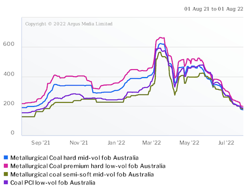 Argus last assessed the semi-soft mid-volatile metallurgical coal price at $180.60/t fob Australia on 29 July, down from $260/t on 1 July and from $400/t on 31 May, but up from $126.90/t on 19 July last year.